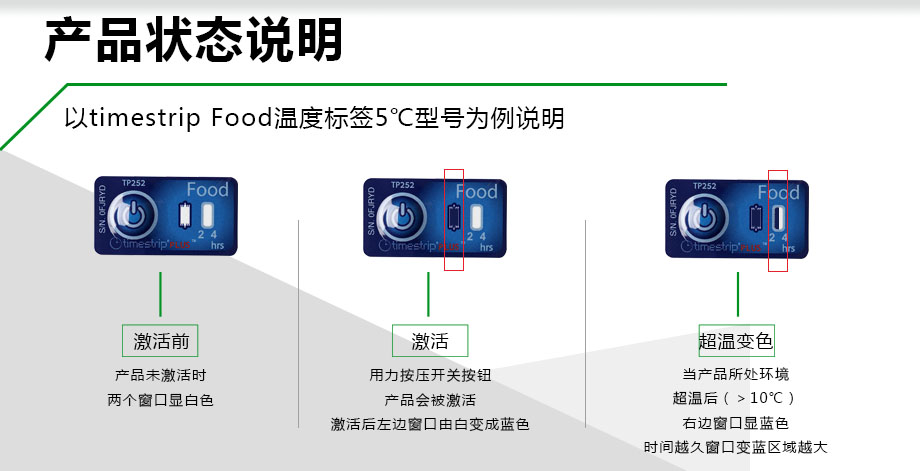 Timestrip温度标签是一个小巧的不干胶标签,是由多层组装的聚合物和铝塑层压板构成的,封装有色液体化学品,该液体化学品被列在由食品和药物管理局批准的食品化学法典中第21条,被认为是安全的(GRAS)。Timestrip温度标签的所有材料均是无毒的,不含乳胶和PVC,可以直接贴在产品,包装或者卡片上。它可以监测温度并指示何时违反设定的大阈值,是不可逆的,也可以记录一个或多个违规的总时间。