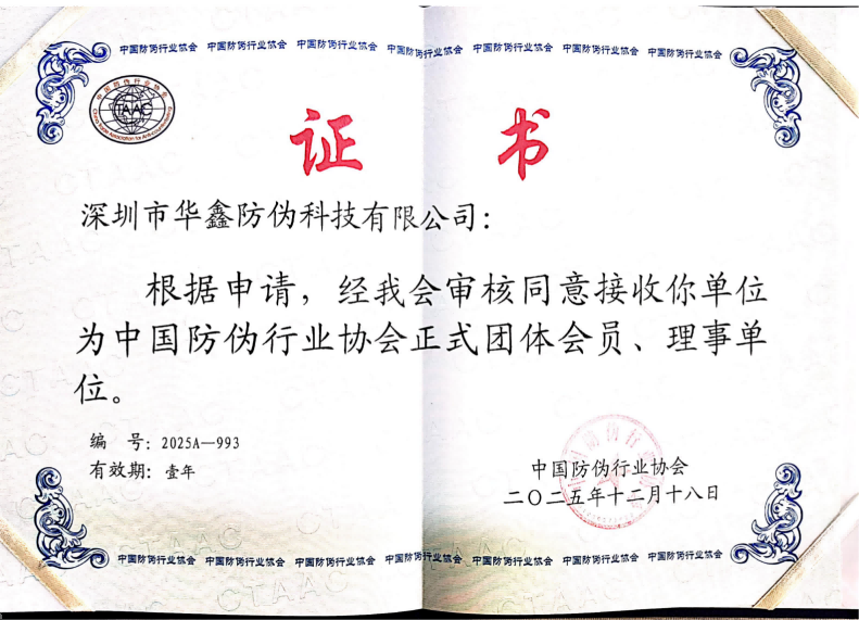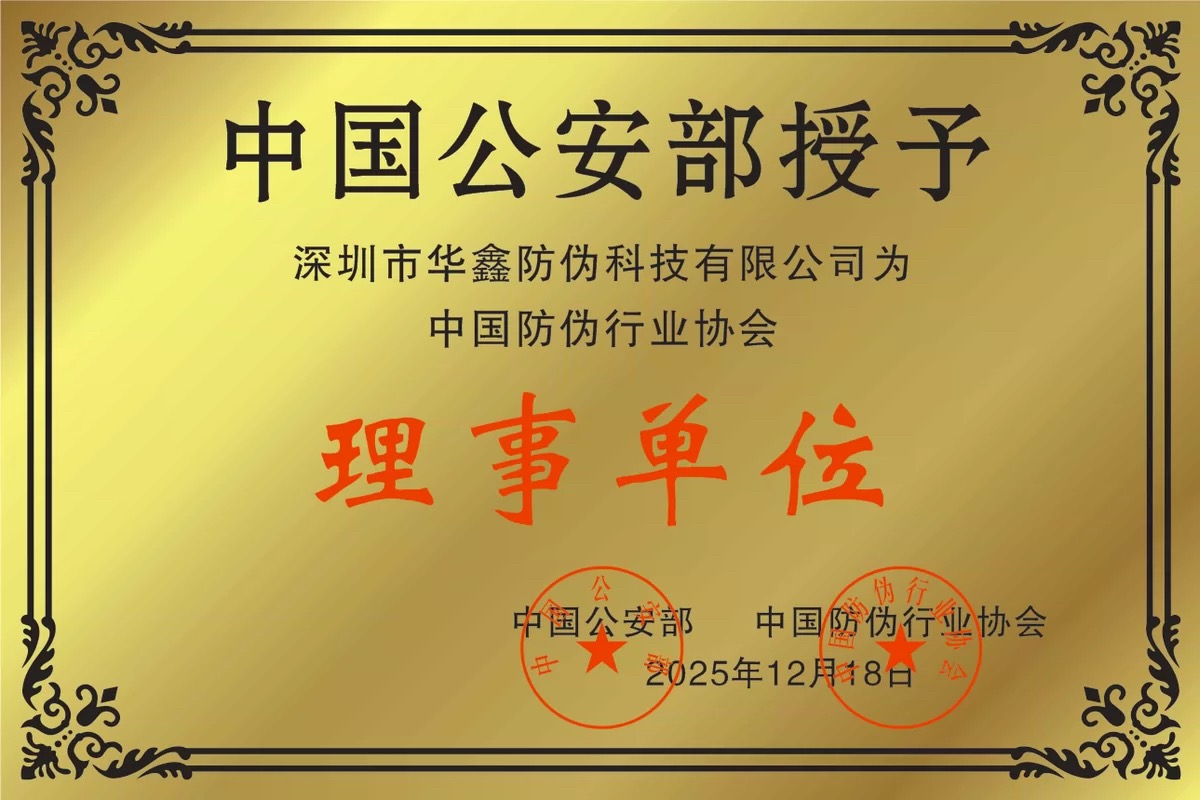 中国公安部授予华鑫防伪为中国防伪行业协会理事单位