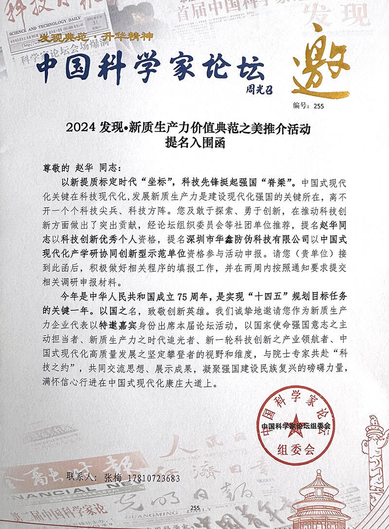 以新提质标定时代“坐标”,科技先锋挺起强国“脊梁”。中国式现代化关键在科技现代化,发展新质生产力是建设现代化强国的关键所在,离不开一个个科技尖兵、科技方阵。您及敢于探索、勇于创新,在推动科技创新方面做出了突出贡献,经论坛组织委员会等社团单位推荐,提名赵华同志以科技创新优秀个人资格,提名深圳市华鑫防伪科技有限公司以中国式现代化产学研协同创新型示范单位资格参与活动申报。请您(贵单位)接到此函后,积极做好相关程序的填报工作,并在两周内按照通知要求提交相关调研申报材料。
