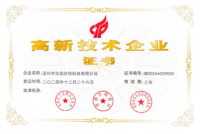 岁末捷报传,华章再续写!值此辞旧迎新之际,深圳市华𠓾防伪科技有限公司(以下简称“华鑫科技”)以卓越的创新实力与行业贡献,于2024年12月26日成功通过国家高新技术企业复审,并斩获多项国家级重磅荣誉,为2024年画上圆满句点!这是全体华鑫人砥砺奋进的硕果,更是中国防伪科技领域迈向高质量发展的璀璨缩影。在此,我们向华鑫科技致以热烈的祝贺!